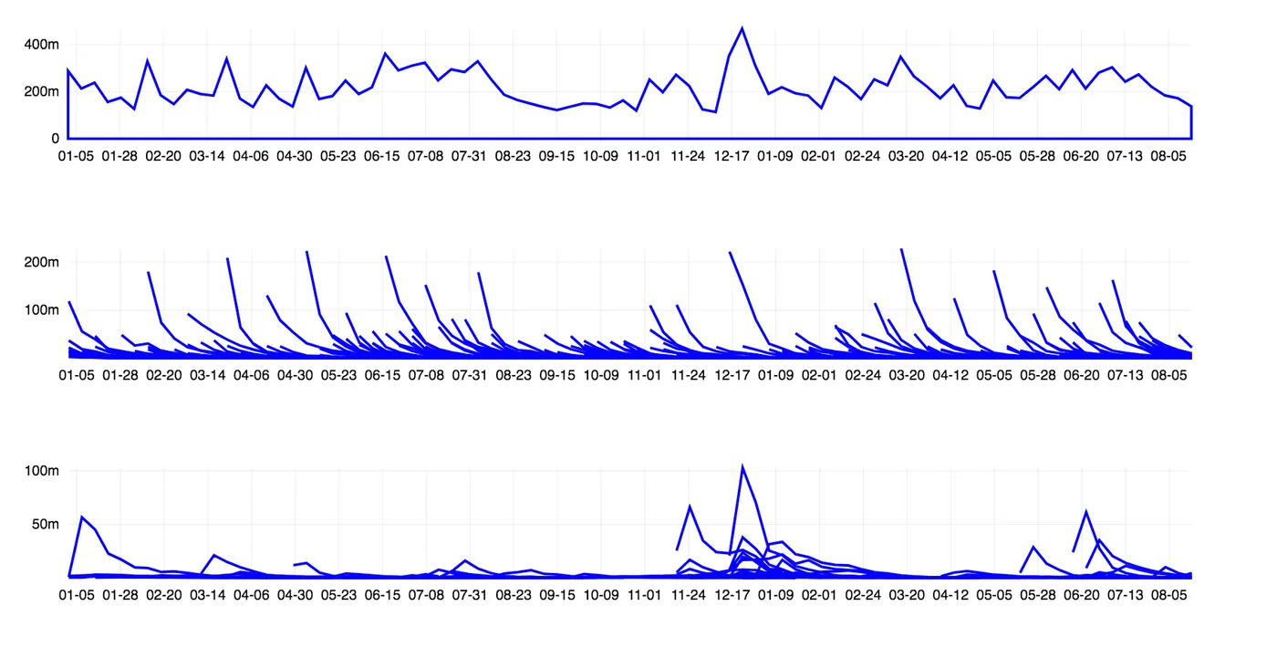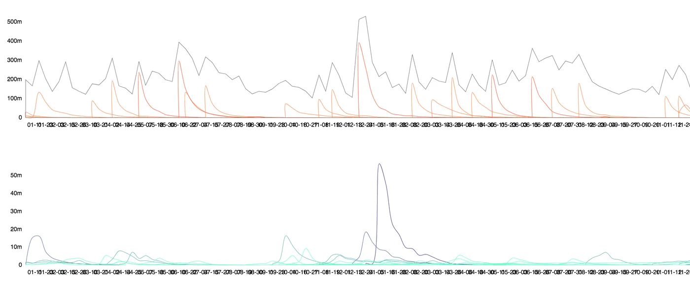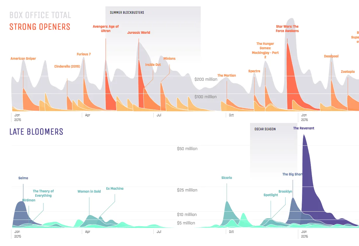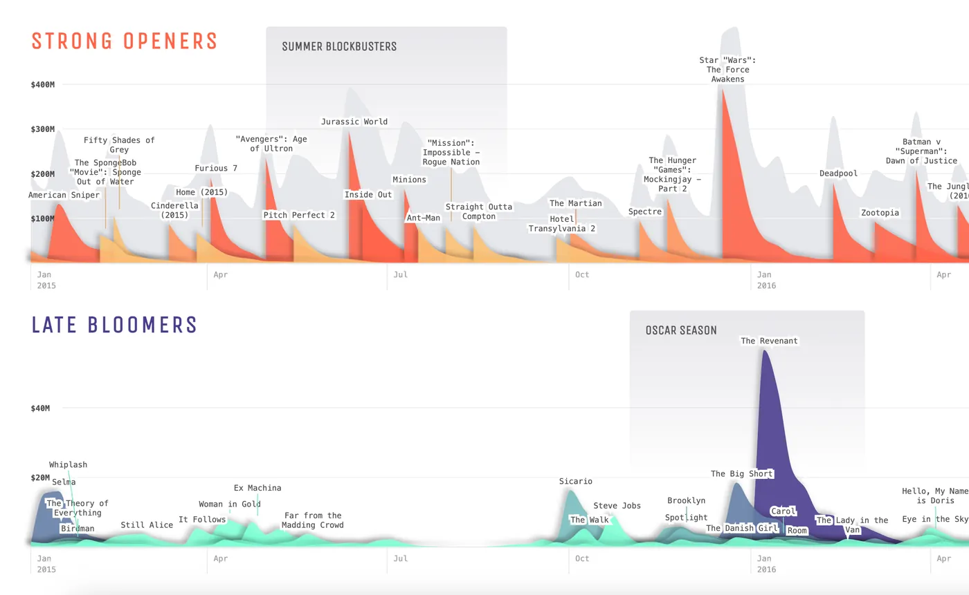 I decided to split them out into two. The Strong Openers would be overlaid on the total box office numbers because they heavily influenced the overall numbers. The Late Bloomers were pulled out into their own chart since the scale of these movies was much smaller and I wanted to highlight their unique trends prominently.