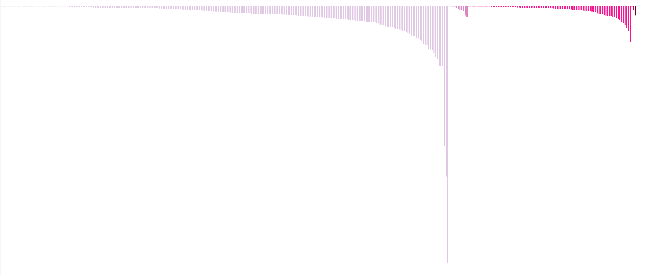 To start, we plotted the source files as a bar chart. The height is the number of lines of code and the color is the number of duplicate bundle files that code appears in.