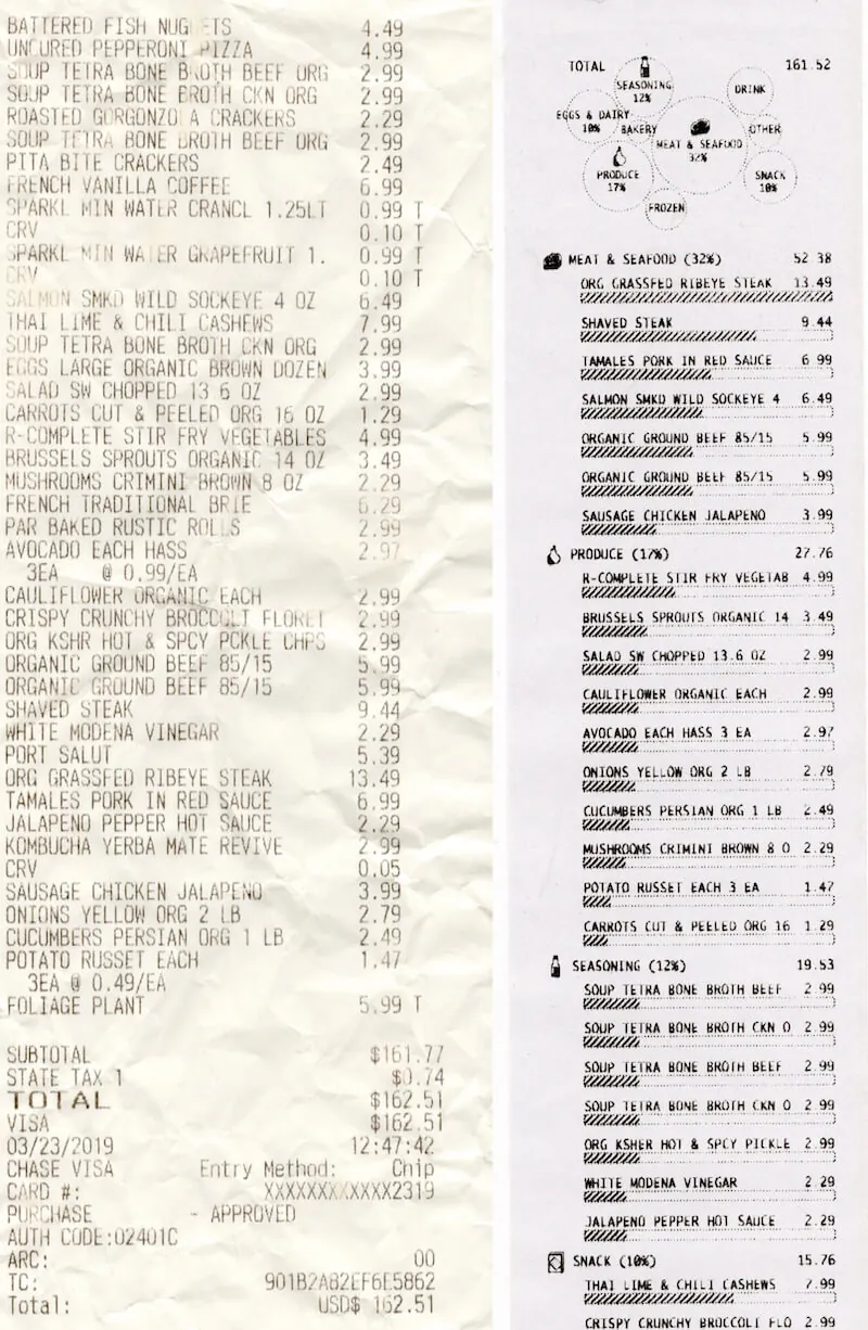 So in this case the ORG GRASSFED RIBEYE STEAK was the most expensive item on the receipt, and so MEAT & SEAFOOD is the first category shown. With the horizontal size limitations in mind, in the bar charts below each label I decided to use the most expensive item to represent a full bar at maximum width. This allowed me to use the same axis across items for easy comparison, without making the bars for lower priced items so tiny that it became difficult to see. Had the bars represented a percentage of the total bill this visibility would have presented an issue.